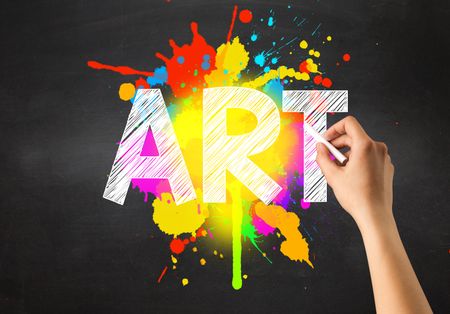 Female hand holding white chalk in front of a blackboard with art written on it and a colorful splash in the background