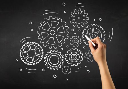 Female hand holding white chalk in front of a blackboard with gears drawn on it