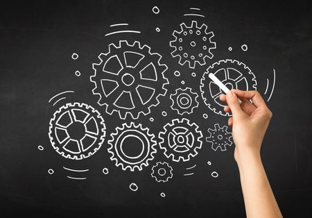 Female hand holding white chalk in front of a blackboard with gears drawn on it