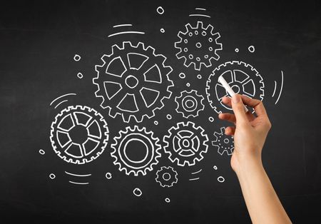 Female hand holding white chalk in front of a blackboard with gears drawn on it