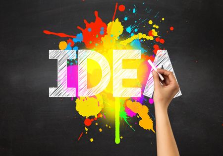 Female hand holding white chalk in front of a blackboard with idea written on it and a colorful splash in the background
