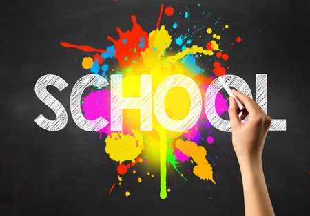 Female hand holding white chalk in front of a blackboard with school written on it and a colorful splash in the background