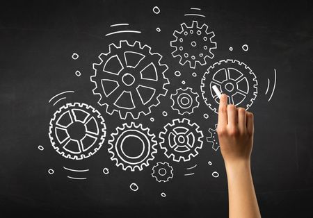 Female hand holding white chalk in front of a blackboard with gears drawn on it