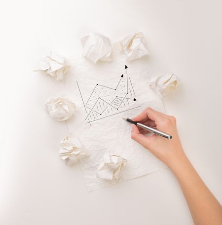 Female hand next to a few crumpled paper balls drawing a progress chart