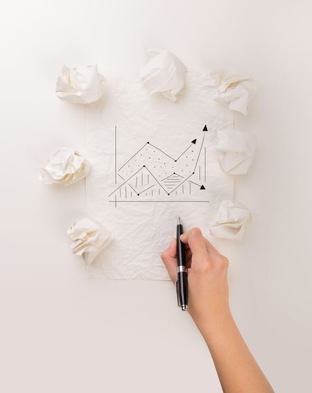 Female hand next to a few crumpled paper balls drawing a progress chart