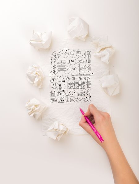 Female hand next to a few crumpled paper balls drawing charts and graphs