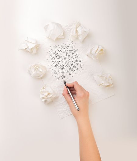 Female hand next to a few crumpled paper balls drawing mixed media icons