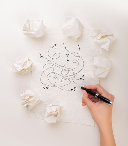 Female hand next to a few crumpled paper balls drawing random scribbles