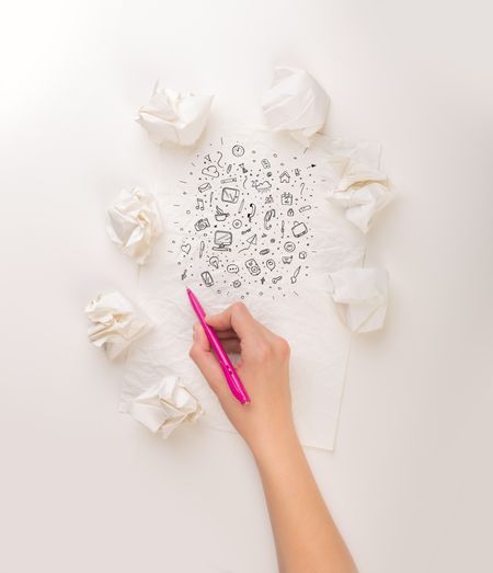 Female hand next to a few crumpled paper balls drawing mixed media icons