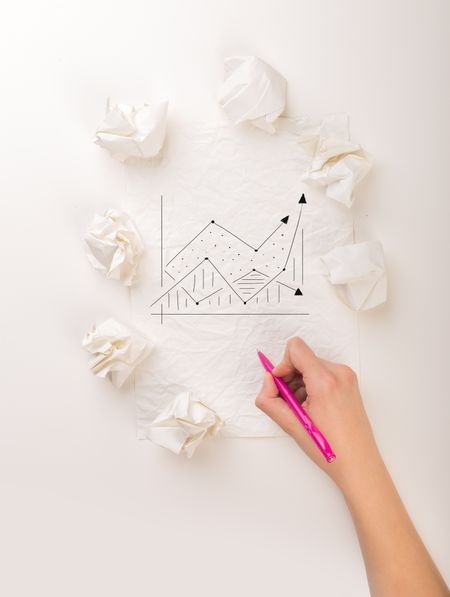 Female hand next to a few crumpled paper balls drawing a progress chart