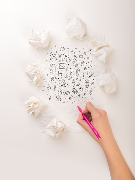 Female hand next to a few crumpled paper balls drawing mixed media icons