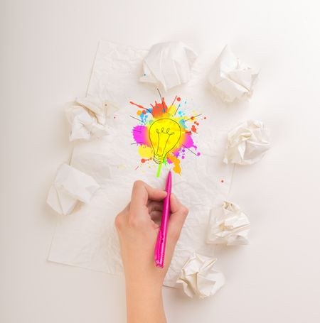 Female hand next to a few crumpled paper balls drawing a colorful lightbulb