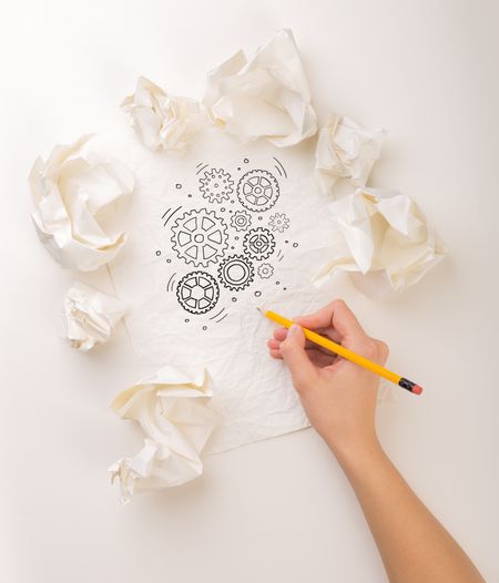 Female hand next to a few crumpled paper balls drawing rotating gears