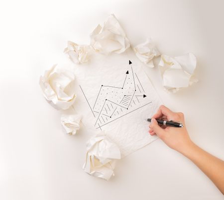 Female hand next to a few crumpled paper balls drawing a progress chart