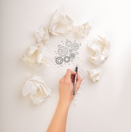 Female hand next to a few crumpled paper balls drawing rotating gears