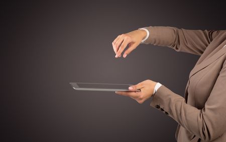 Female hand in suit holding tablet with no wallpaper