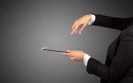 Female hand in suit holding tablet with no wallpaper
