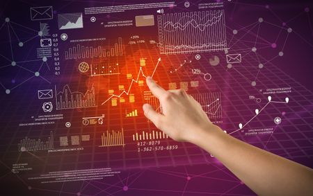 Female hand touching charts and graphs on a red and purple background