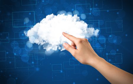 Female hand touching cloud with blue background