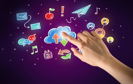 Female hand toucing mixed media icons with purple background