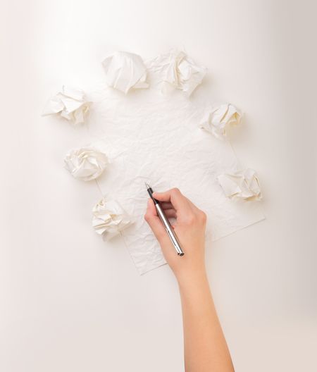 Female hand trying to write next to a few crumpled paper balls
