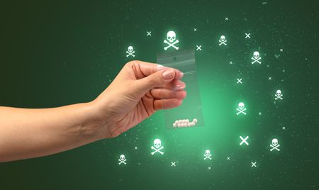 Female handing over pills with skull concept