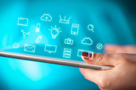 Female hands touching tablet with white technology related icons