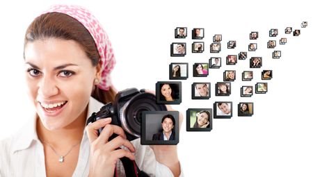 Female photographer holding the camera - isolated over a white background