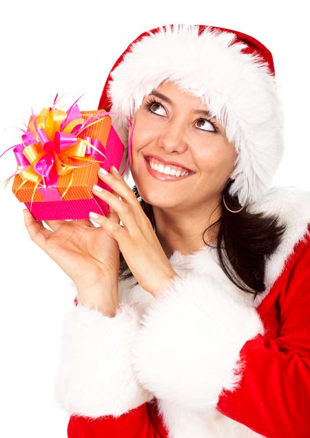 female santa holding a christmas gift smiling