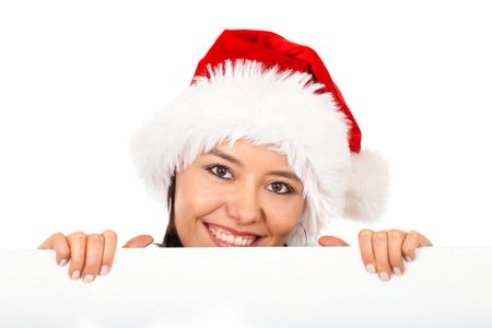 Female santa holding a christmas white card - isolated over a white background