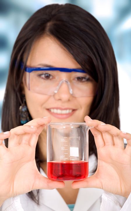 female scientist in a laboratory holding a test tube with red liquid