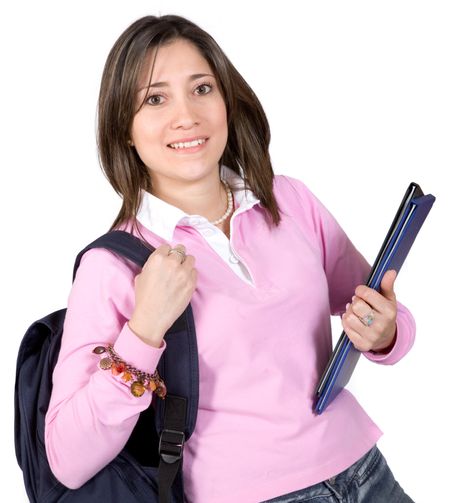 female student with books and bag over a white background