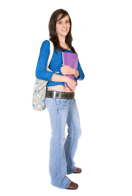 female student carrying her books and bag over white
