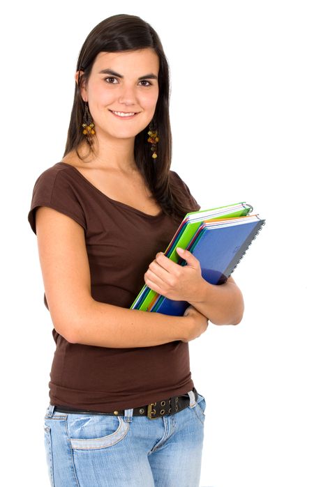 female student carrying notebooks over a white background