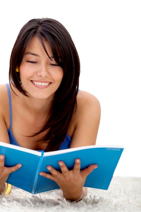 Female student lying on the floor reading a book
