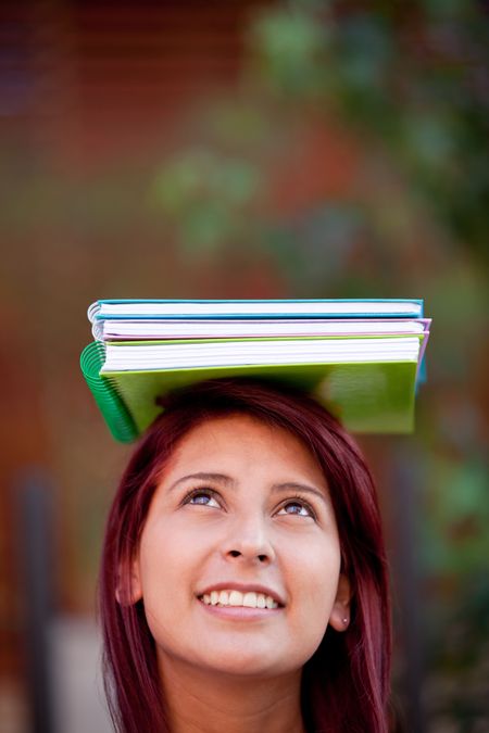 Female student with notebooks on her head outdoors