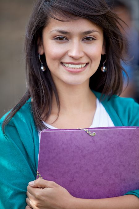 Female student outdoors holding a notebook and smiling