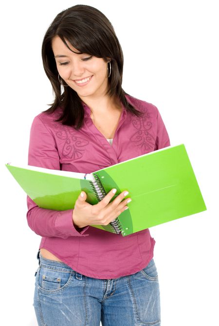 female student reading a notebook over a white background