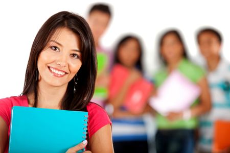 Female student smiling with a group behind her ? isolated