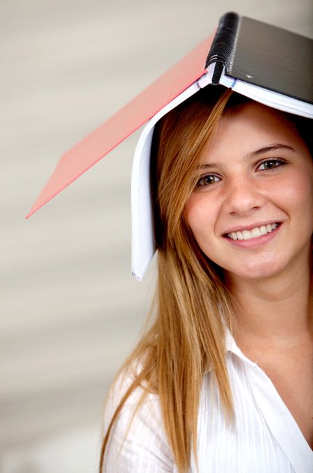 female student smiling with a notebook on top of her head