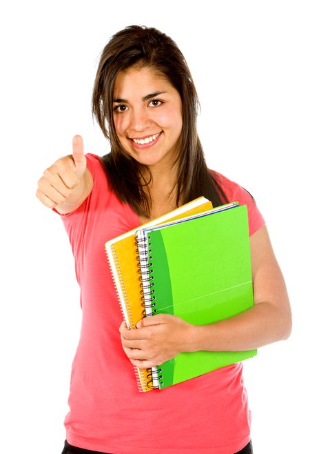 Female student with her thumbs up isolated on white