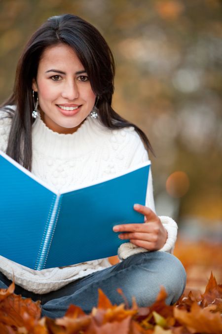 Female studying outdoors during the fall or autumn period