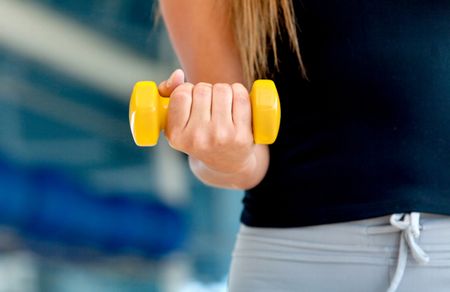 Female torso with a yellow free-weight at the gym