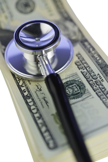 Financial checkup: Stethoscope on pile of U.S. twenty-dollar bills isolated on white background