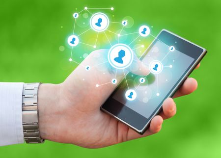 Finger pointing on smartphone with social network illustration