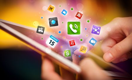 Finger pointing on tablet pc, social network concept