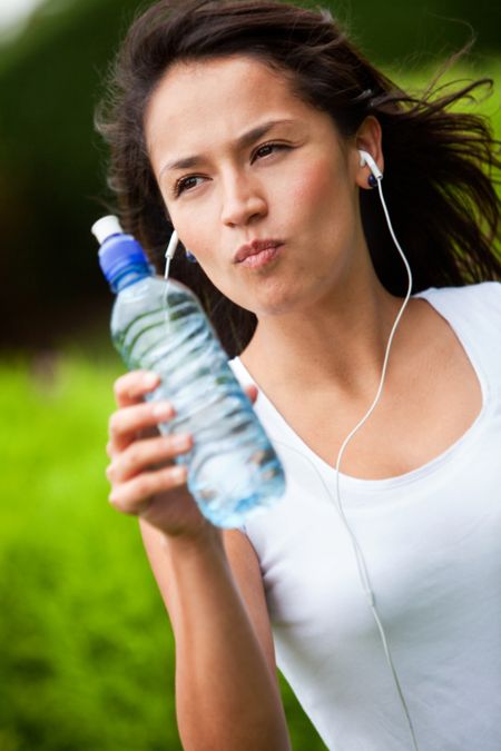 Fit woman drinking water while training outdoors