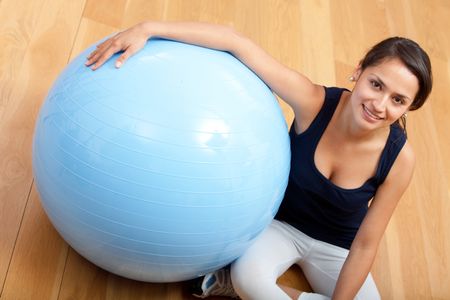 Fit woman at the gym smiling with a pilates ball