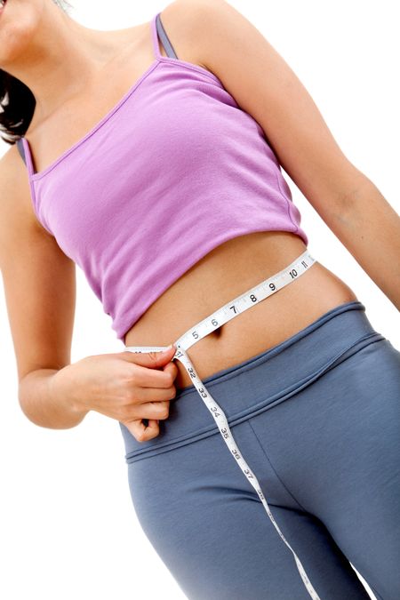 Fit woman measuring her waist - weight loss concepts