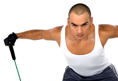 fitness guy training with resistance cords isolated over a white background
